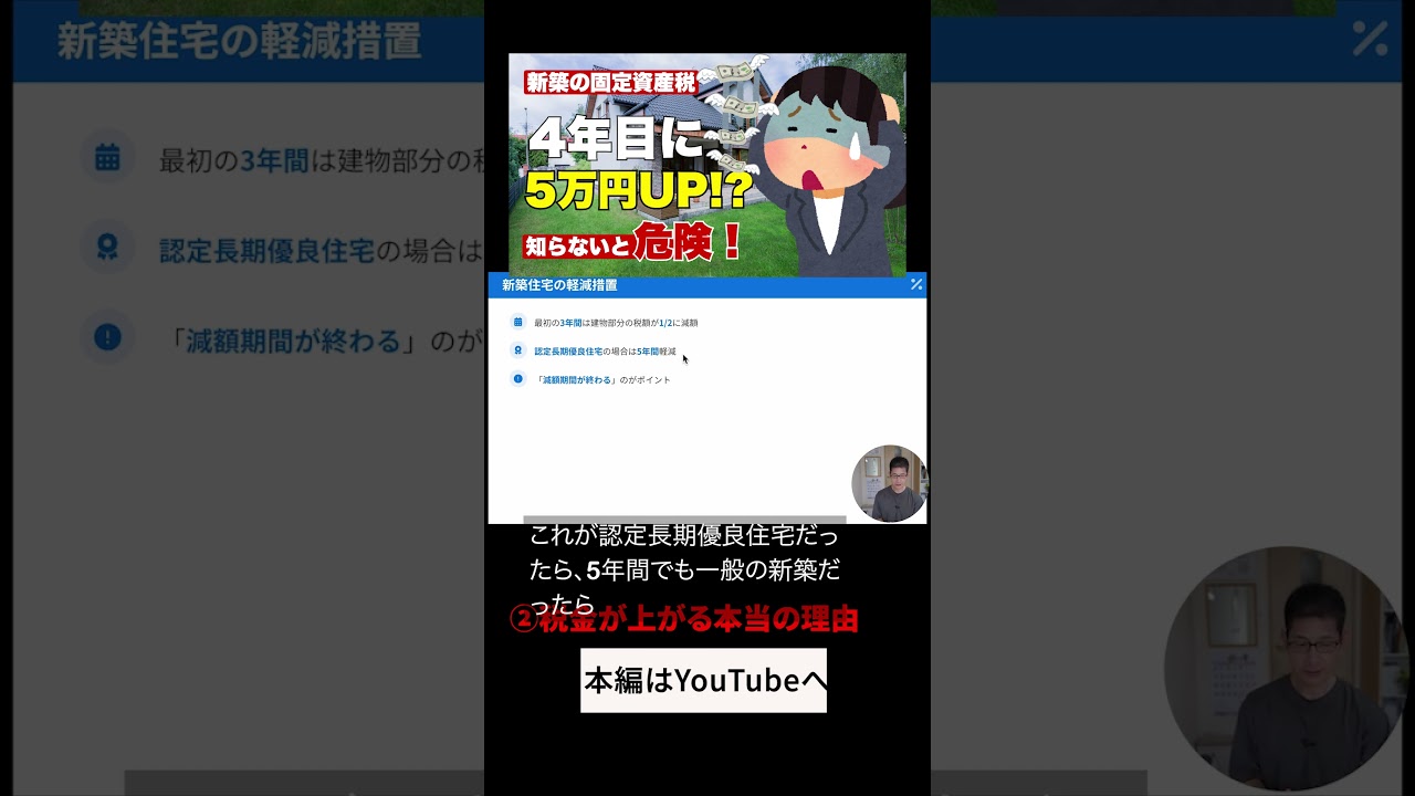 #固定資産税 #新築一戸建て #マイホーム 「新築4年目に固定資産税が5万円も上がった!?」 その理由は、最初の3年間だけ適用される「軽減措置」が終わるからなんです。 これは税金が不当に上がったのではなく、”本来の税額に...