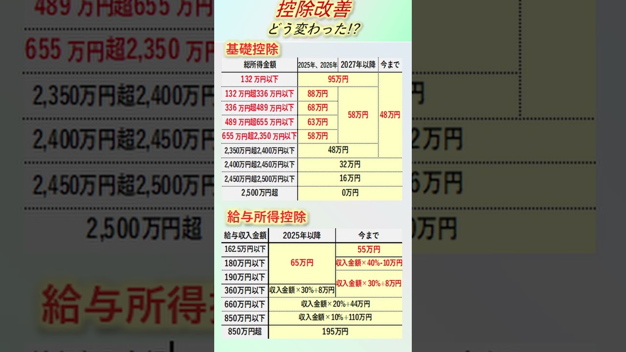 2025年から基礎控除、給与所得控除が改善されました。 国税庁のHPを見ても現在の控除金額がぱっと見て分かる資料が見当たらなかった為、自分でまとめてみました。 なお、基礎控除は住居者の方の金額を記載しております。 非居住...