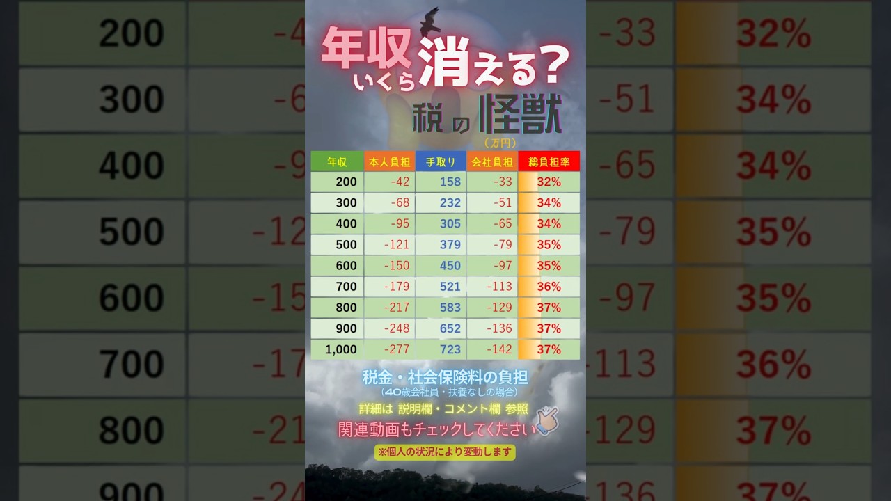 続きを読む💰年収別の手取り・税金・社会保険料の負担率を徹底解説! この動画では、給与明細では見えない「会社負担の社会保険料」も含めた 真の税・社会保険料負担率をお見せします。 📈 チャンネル登録で最...