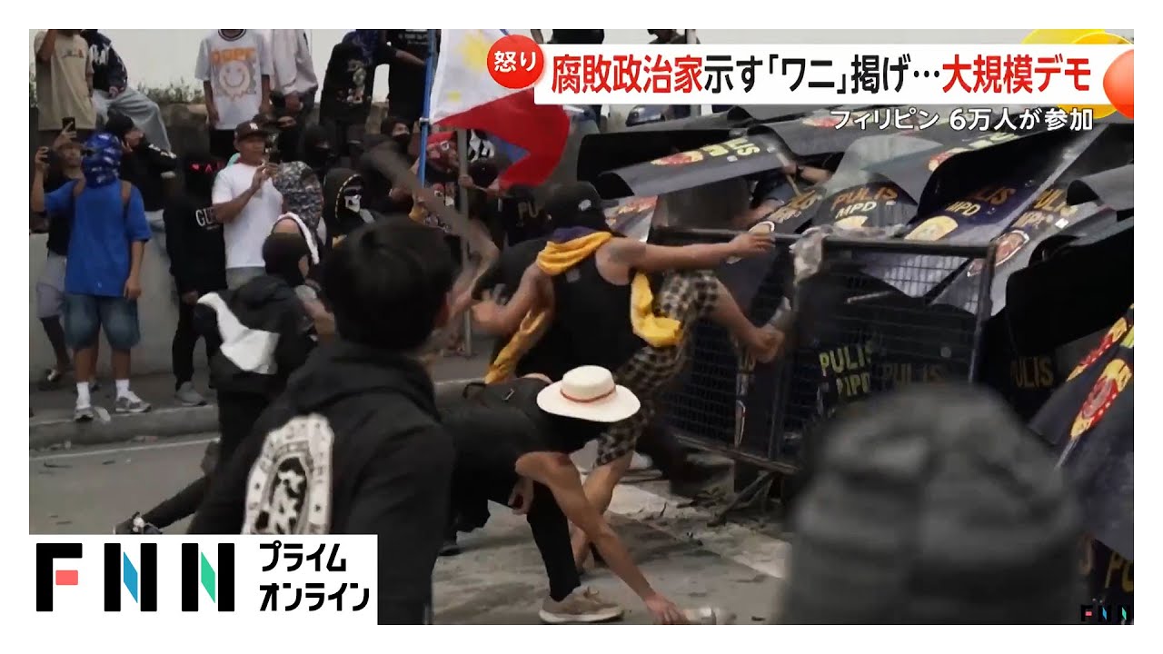 続きを読む盾を持った警官隊に飛びかかる人々。 フィリピンで行われたデモで、参加者が警察と衝突しました。 21日、フィリピンの首都マニラなどで約6万人が参加する大規模なデモが行われました。 腐敗した政治家を象徴する「ワニ」を用いて訴...