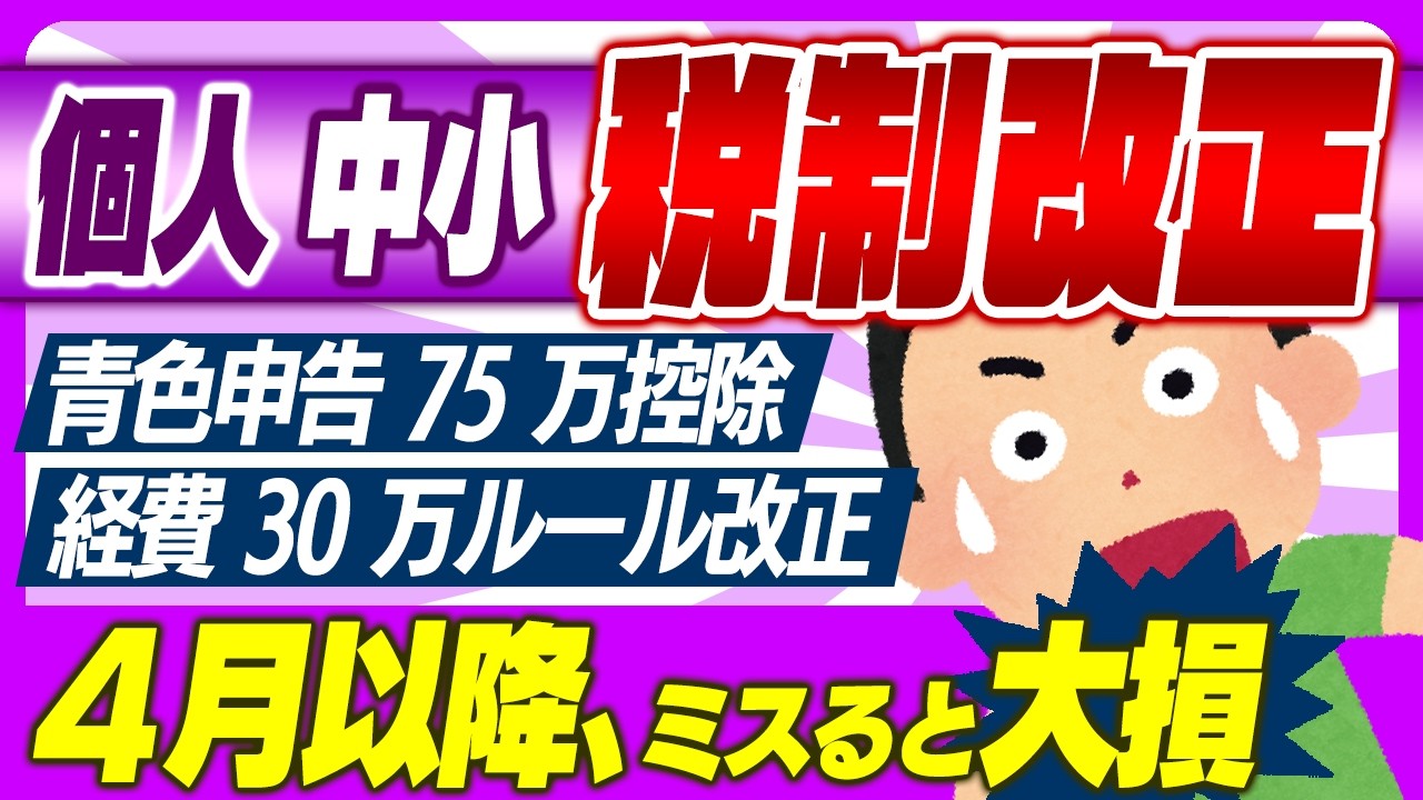 こちらの動画はyoutubeから埋め込み引用しております。 「少額減価償却資産(30万円ルール)」や「消費税インボイス制度」など、個人事業主や中小企業に実務上の影響が大きい「令和8年税制改正」について解説します。 0:0...