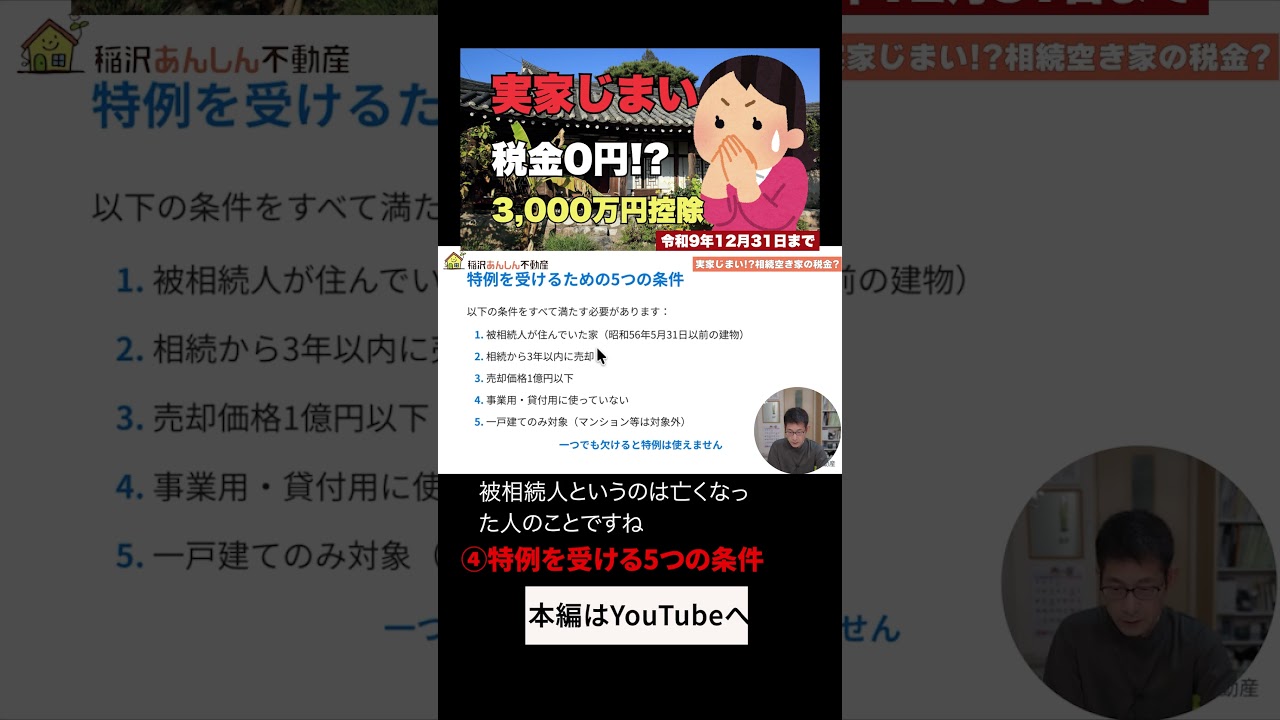 #相続税対策 #空き家活用 #不動産売却 親から相続した実家、売却時の税金がゼロになるかも…? 実は「相続空き家の3,000万円特別控除」という制度があります。 しかし、これには【5つの条件】があり、一つでも満たせないと...