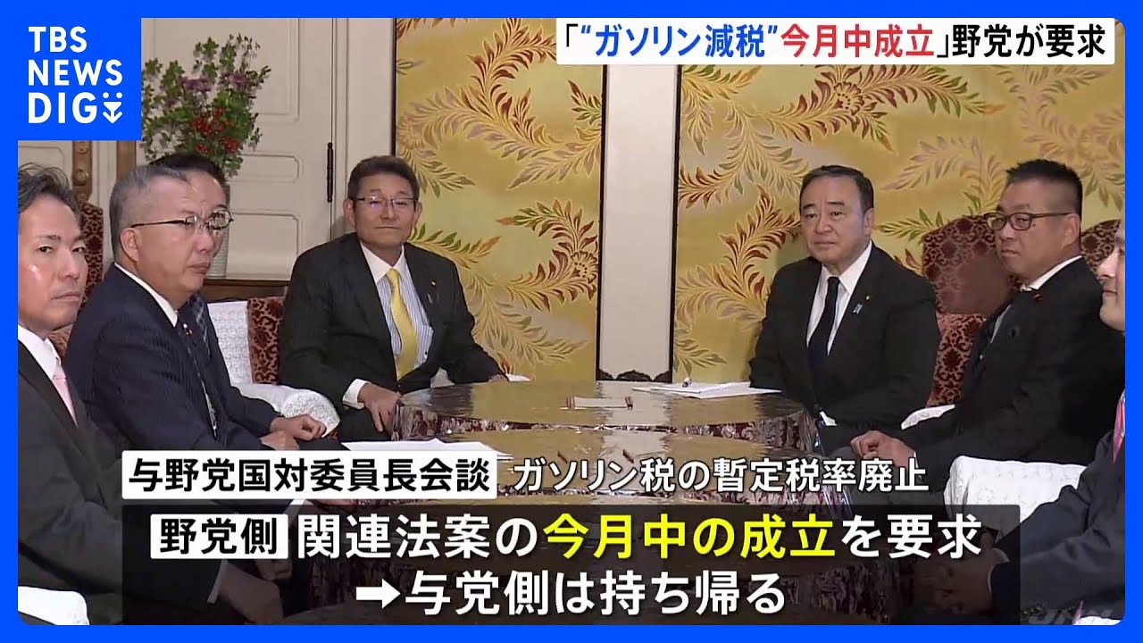 国会ではけさ、与野党の国対委員長が会談し、野党側はガソリン税の暫定税率を廃止するための法案を今月中に成立させるよう求めました。 ガソリン税の暫定税率をめぐっては、与野党は年内のできるだけ早い時期に廃止することで合意しています。 けさ行われた与野党の国対委員長会談で、野党側は関連法案を今月中に成立させるよう要求し、与党側は持ち帰りました。 また、議員定数削減について、与党側は関連法案を今