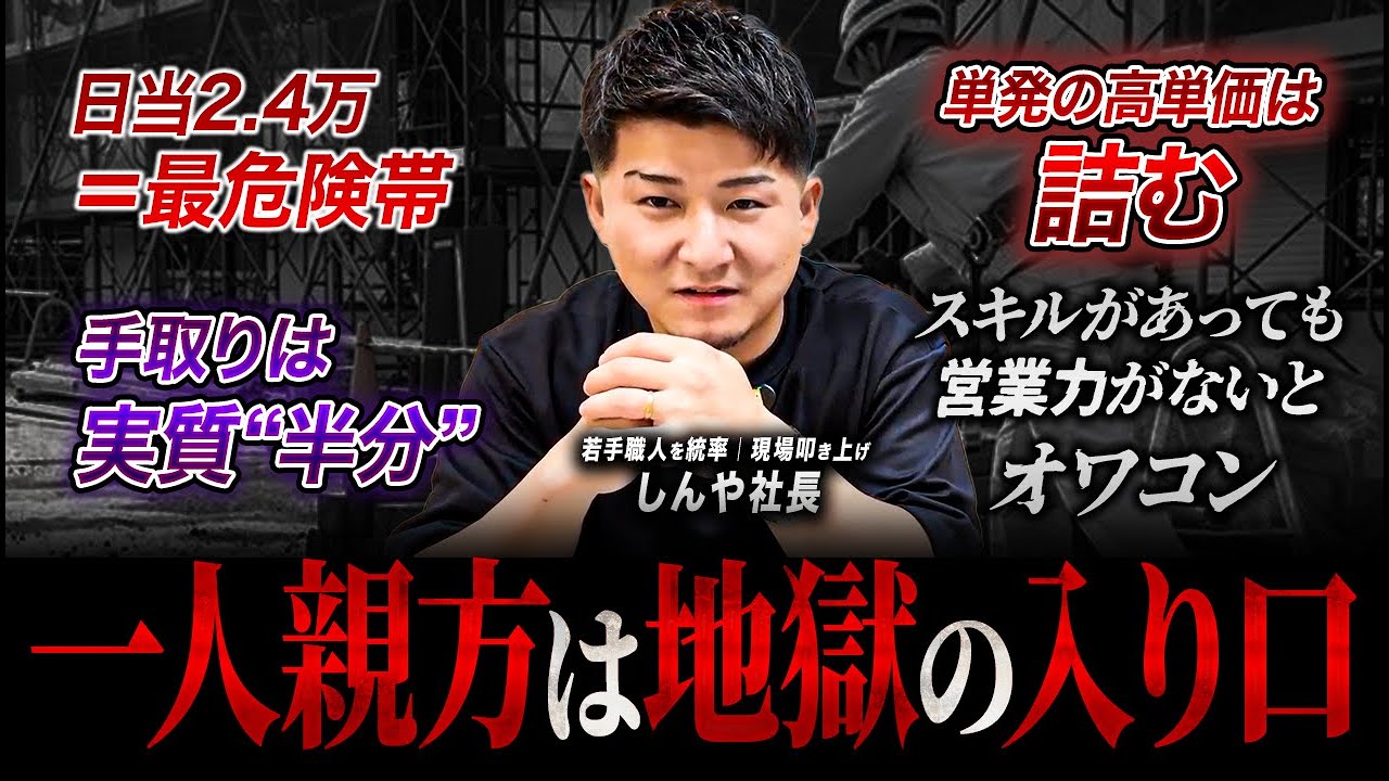 こちらの動画はyoutubeから埋め込み引用しております。 下請けから“日当アップ”で独立➡︎これが地獄の入り口です。 今回の動画は「一人親方が陥りやすい落とし穴」に関する実例ベースでの解説と、 そもそも独立した方がいいのか?という悩みへのアンサーとなる動画です。 【こんな人は必見】 ・これから独立を考えている職人 ・すでに一人親方で「稼げてない」違和感がある人 ・日当が上がっ