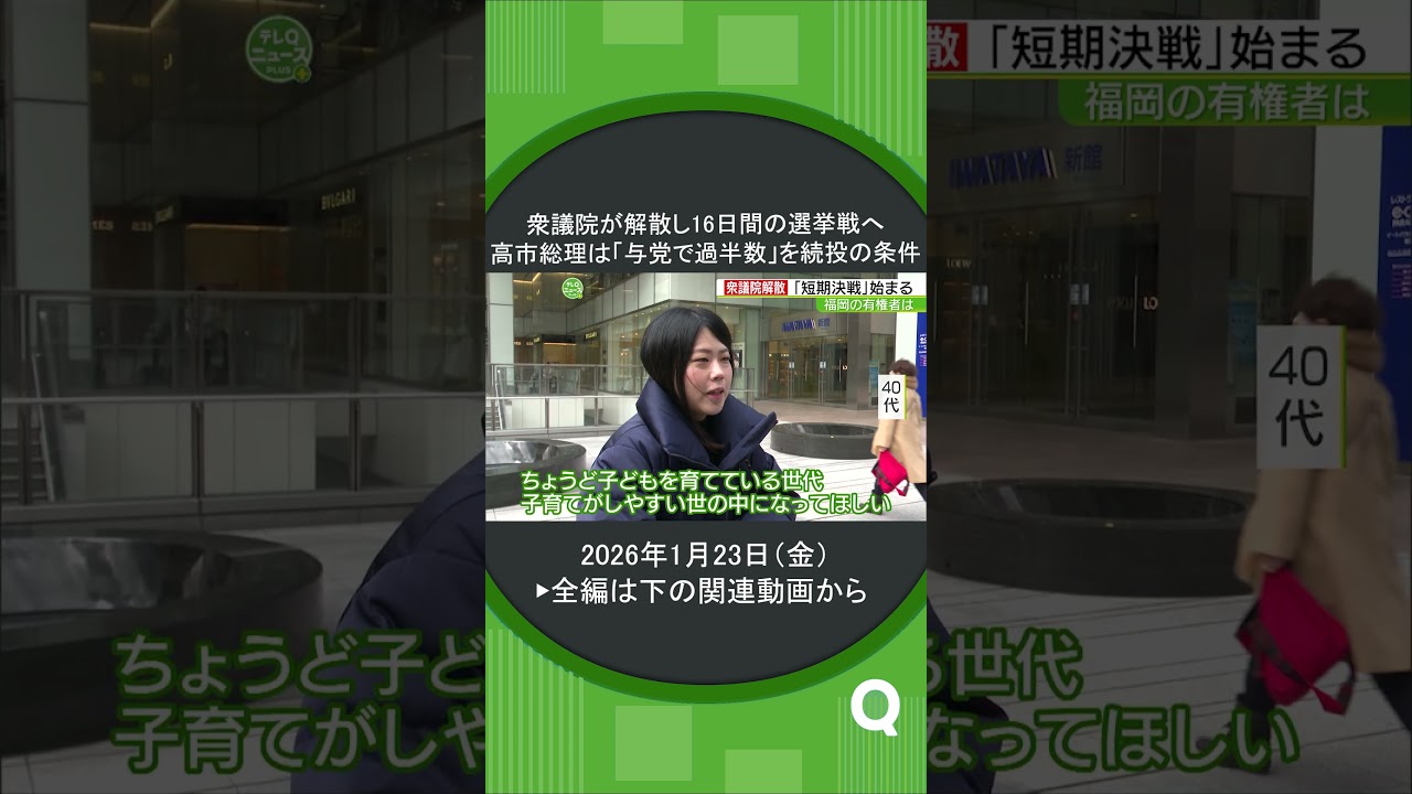 通常国会の開会に合わせ、衆議院が日本国憲法第7条に基づき解散され、2月8日の投開票まで16日間という戦後最短の選挙戦となります。自民・維新連立政権の評価や物価高対策が主な争点で、福岡の有権者からは賃上げ、安全な暮らし、働く人の保障、子育て支援などへの期待が聞かれます。解散時の議席は与党が233で過半数ぎりぎりとなり、高市総理は「与党で過半数」を続投の条件としました。一方、立憲と公明の新党「中