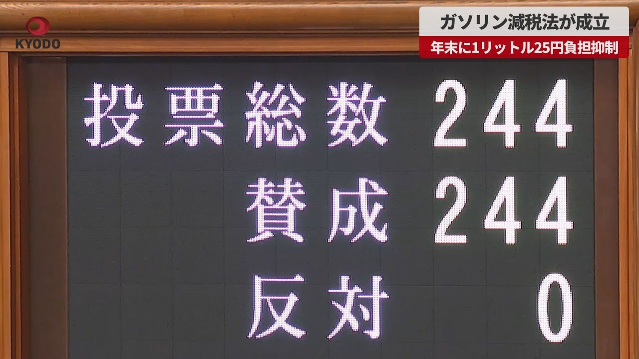 ガソリン税に上乗せされる暫定税率の廃止法が28日、参院本会議で可決、成立した。12月31日で1リットル当たり約25円の税負担がなくなる。軽油引取税の暫定税率(同約17円)は来年4月1日で終了する。高市政権の物価高対策の一環。国と地方合わせて年約1兆5千億円の税収減をどう補うかに焦点が移る。 #kyodonews #共同通信 #速報 #ガソリン税 #暫定税率 #廃止 #参院本会議 #成立 Y